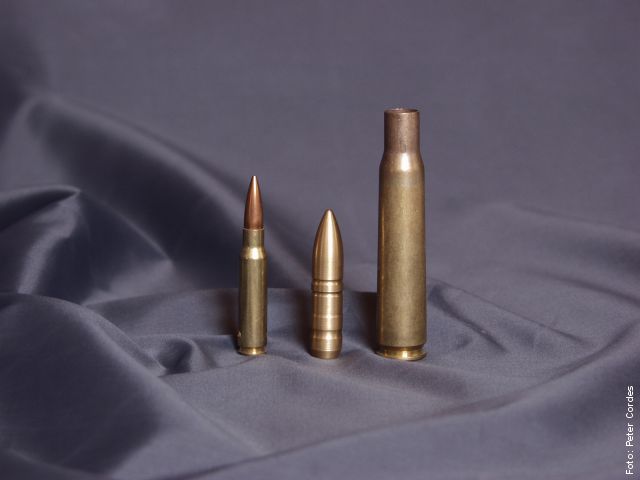 Auf dem Tisch sieht man deutlich eine Patrone dieses Kalibers.