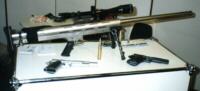 Im Vordergrund liegen zwei LAR "Grizzly"-Pistolen im Kaliber .50 AE.